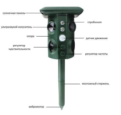 - Вибрационный моторчик. Находится он внизу стойки, после активации работы устройства начинает вибрировать, колебания распространяются по земле. Такого воздействия животные также стараются избежать;