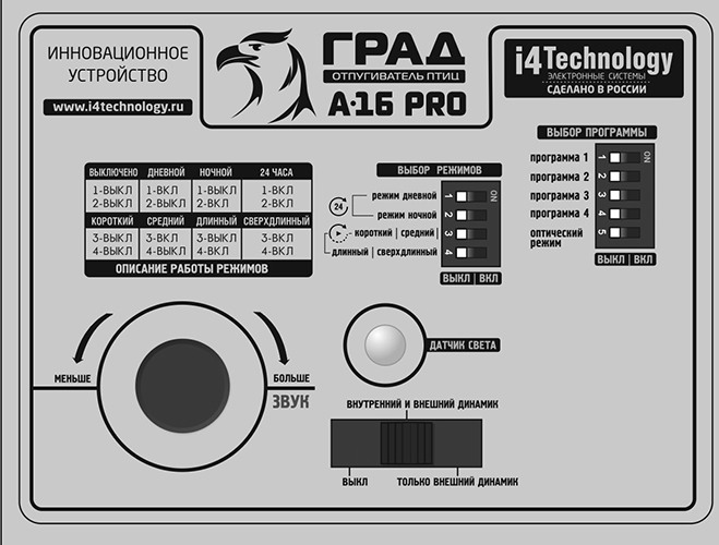 - 4 автоматические программы. Все голоса, записанные в памяти, распределены по программам, рассчитанным на отпугивание разных видов птиц-вредителей. Пользователю не требуется вручную включать те или иные голоса, а нужно только выбрать одну или несколько программ, которые составлены специалистами. Это гораздо проще, обеспечивает наилучший результат в отпугивании конкретных видов птиц, обитающих на вашей территории, и полностью исключает возможность привыкания пернатых к отпугивающим сигналам.