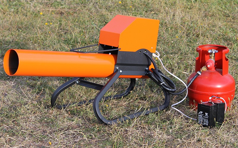 - Экономное потребление газа. Устройство потребляет газ очень экономно — 10 кг пропана хватает на 17 тысяч выстрелов. При интервале 30 минут пушка сможет работать от одного баллона 27 л почти целый год.